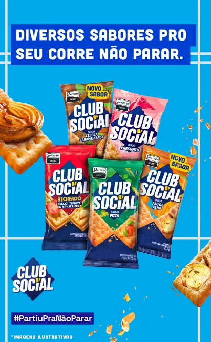 Club Social possui a maior variedade de biscoitos para o seu corre não parar! São eles: Club Social Original Club Social Queijo Club Social Presunto, Club Social Pizza Club Social Requeijão Club Social Mix de queijos Club Social Bacon e provolone Club Social Cebola com Sour cream Club Social IntegralClub Social queijo parmesão e vegetais Club Social tomate seco e salsinha Club Social queijo, tomate e manjericão